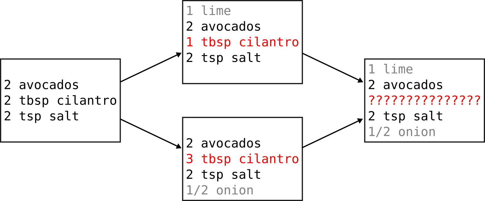 We will make two branches, make two conflicting changes (both increase and decrease the amount of cilantro), and then try to merge them together. Git won’t decide which to take for you, so will present it to you for deciding. We do that and commit again to resolve the conflict.